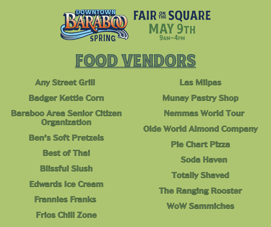 Any Street Grill, Badger Kettle Corn, Baraboo Area Senior Citizen Organization, Ben’s Soft Pretzels, Best of Thai, Blissful Slush, Edwards Ice Cream, Frannies Franks, Frios Chill Zone, Las Milpas, Munay Pastry Shop, Nemmas World Tour, Olde World Almond Company, Pie Chart Pizza, Soda Haven, Totally Shaved, The Ranging Rooster, WoW Sammiches